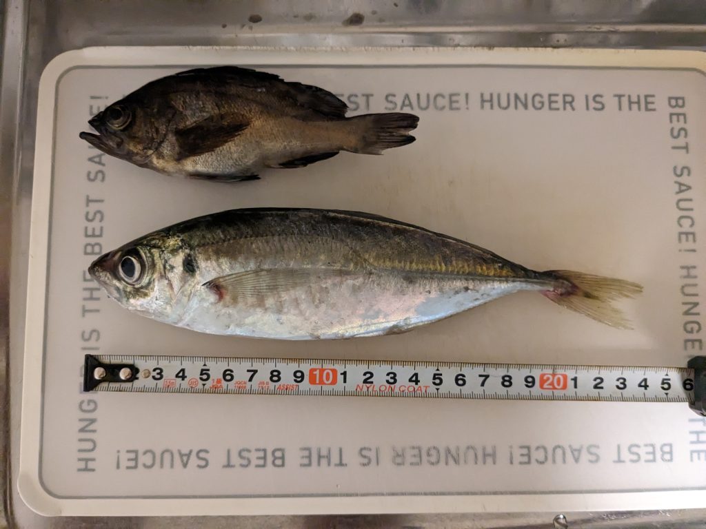 ポイントがわからず、満潮まで常夜灯付近で狙うも良型のアジ1匹とミニメバル1匹のみ