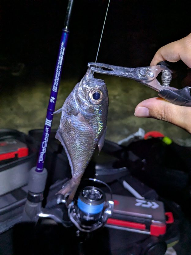 ポイントがわからず、満潮まで常夜灯付近で狙うも良型のアジ1匹とミニメバル1匹のみ